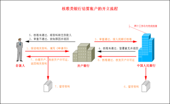 6.结果送达:人民银行一般采取由开户银行机构代为送达的方式,补正告知书、不予受理决定书、开户许可证、不予行政许可决定书送交开户银行,视为送达。开户银行机构应在规定时限内领取审批结果,并按照开户银行机构内部工作流程向申请人发放开户许可证。
